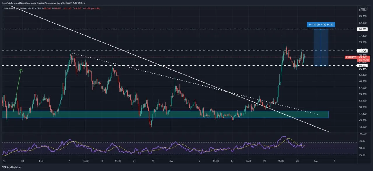 “Axie Infinity ini akan mengalami sentimen positif karena game play-to-earn mereka akan rilis di IOS dan Android. Jika dilihat dari roadmap-nya ini sudah sesuai dengan timeline yang ada. Analisis teknikal melihat nilai AXS bisa meroket hingga 21% dari harga $ 66,” jelas Afid.