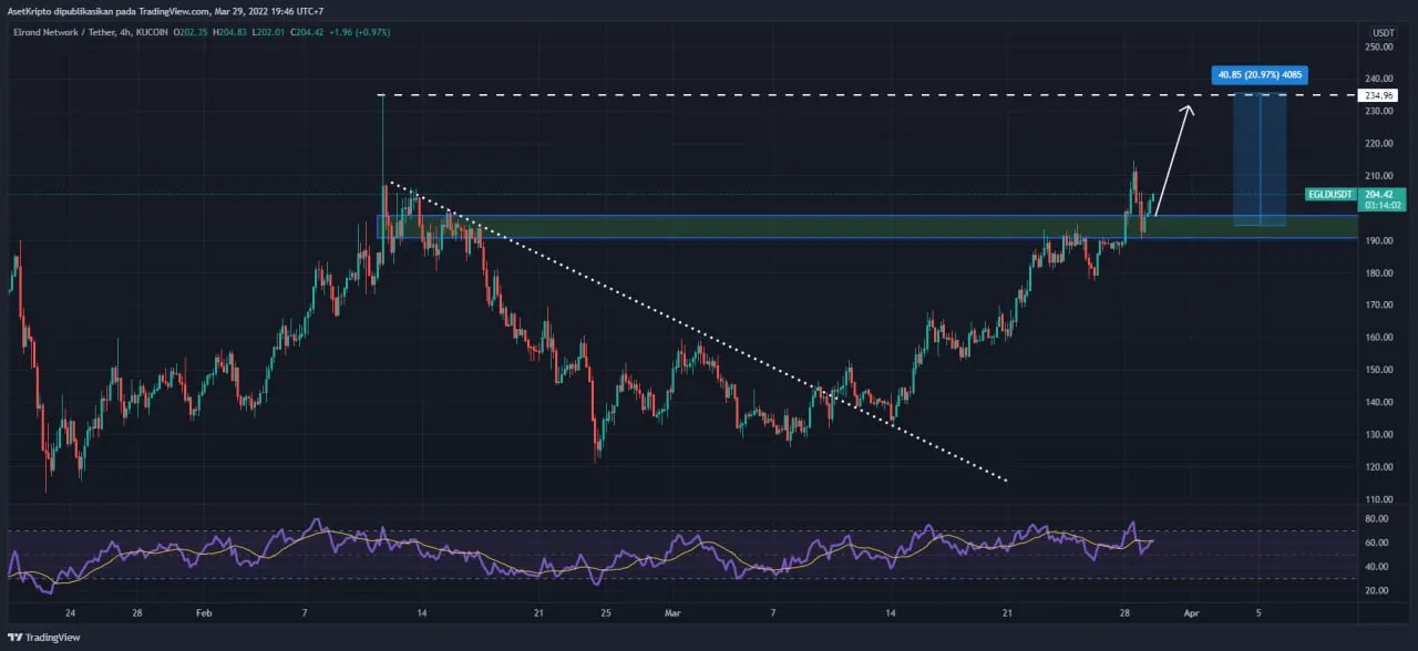 “Berita kemitraan EXC Global dan Elrond Network sukses meningkatkan harga EGLD. Dari segi analisis teknikal, nilai EGLD terus melonjak tinggi sejak awal pekan. Pada minggu ini diperkirakan akan ada lonjakan nilai hingga 20% dari harga $ 204 mencapai $ 234,” kata Afid.