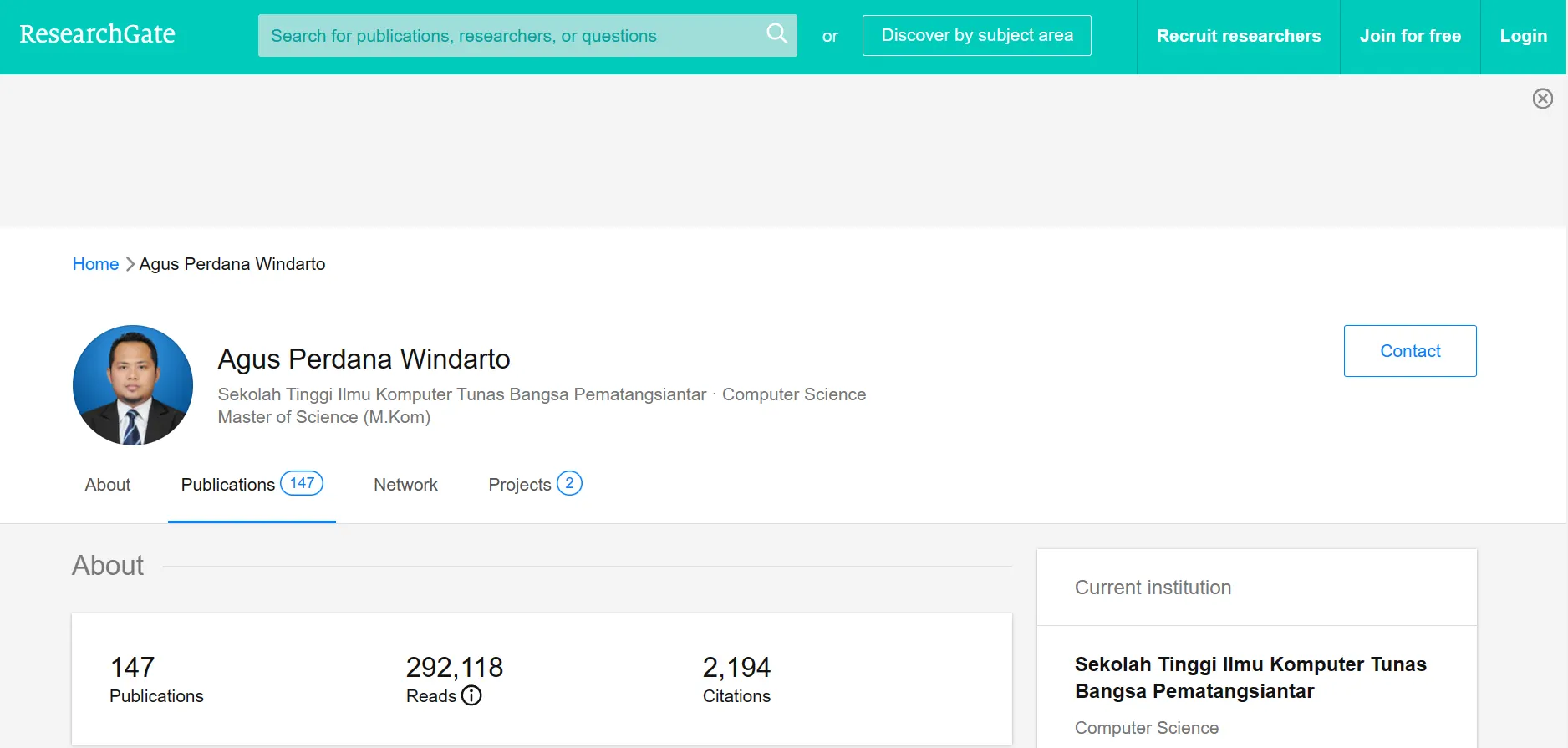 Menjadi dosen tidak menghalangi Agus Perdana Windarto S.Kom., M.Kom. untuk terus mengukir prestasi dengan cara mempublikasikan banyak penelitian. Berfokus pada subjek 'Engineering & Technology' sejak 2016, Agus Perdana Windarto S.Kom., M.Kom. setidaknya sudah mempublikasikan 311 hasil tulisannya, dilansir dari akun ‪Google Scholar‬-nya. Selain data dari Google Schoolar, Agus Perdana Windarto S.Kom., M.Kom. juga memiliki akun Research Gate dan sudah mempublikasikan tulisannya di sana sebanyak 147 publikasi yang memiliki total sitasi sebanyak 2.194 kali.