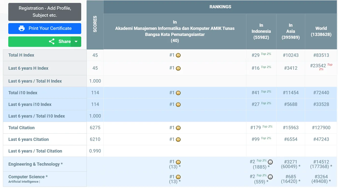 Agus Perdana Windarto menempati peringkat 2 'Indonesia Top 10.000 Scientist' pada kategori Subjek 'Engineering & Technology' atau juga dikenal dengan 'Teknik & Teknologi'. Dengan hasil skor yang tertera di bawah, Agus Perdana Windarto menempati peringkat #29 Indonesia, #10243 Asia, dan #83513 Dunia secara keseluruhan subjek.