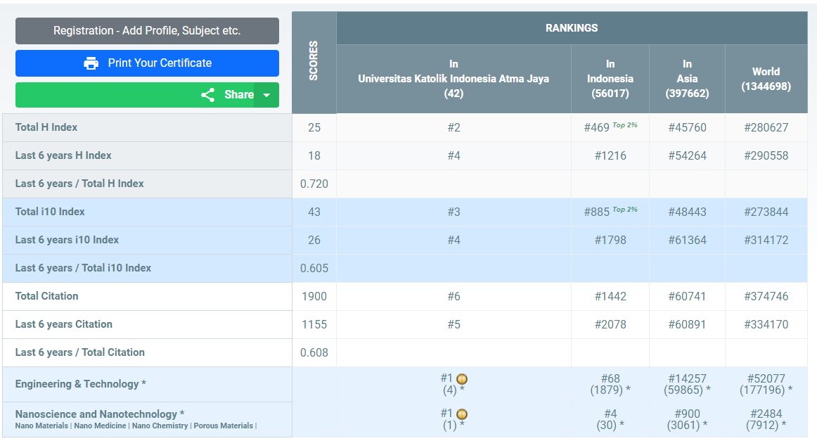Dengan hasil skor yang tertera di bawah, Eko Adi Prasetyanto menempati peringkat #2 Universitas, #469 Indonesia, #45760 Asian, dan #280627 Dunia secara keseluruhan subjek yang termasuk ke dalam kategori AD Scientific Index 2023.