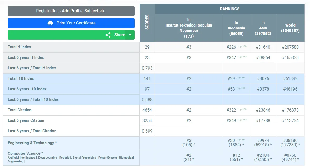 Dengan hasil skor yang tertera di bawah, Mauridhi Hery Purnomo menempati peringkat #3 Universitas, #226 Indonesia, #31640 Asian, dan #207580 Dunia secara keseluruhan subjek yang termasuk ke dalam kategori AD Scientific Index 2023.