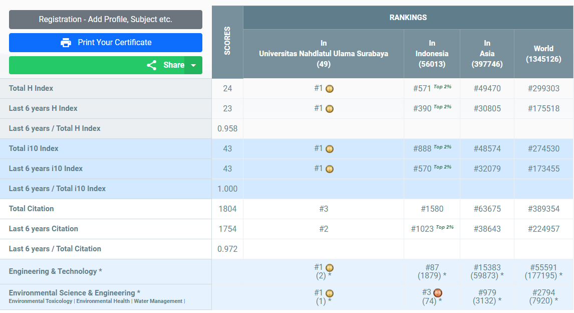 Teknologi.id - Achmad Syafiuddin menjadi Dosen di Universitas Nahdlatul Ulama Surabaya (Unusa) menempati peringkat 93 'Indonesia Top 10.000 Scientist' kategori Subjek Engineering & Technology. Pemeringkatan ini dilakukan oleh AD Scientific Index yang merupakan sistem pemeringkatan dan analisis tahunan berdasarkan kinerja ilmiah dan produktivitas dari sebuah universitas dan/atau seorang ilmuan.