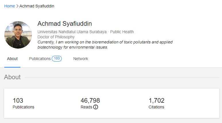Achmad Syafiuddin, S.Si., M.Phil., Ph.D. adalah dosen tetap di Universitas Nahdlatul Ulama Surabaya (Unusa). Achmad Syafiuddin, S.Si., M.Phil., Ph.D. memperoleh gelar S1 di Institut Pertanian Bogor pada 2014, S2 di Universiti Teknologi Malaysia pada 2016 dan S3 di Universiti Teknologi Malaysia pada 2019.