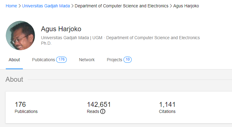 Teknologi.id - Agus Harjoko menjadi Dosen di Universitas Gadjah Mada (UGM) Yogyakarta dan menempati peringkat 60 'Indonesia Top 10.000 Scientist' kategori Subjek Engineering & Technology. Pemeringkatan ini dilakukan oleh AD Scientific Index yang merupakan sistem pemeringkatan dan analisis tahunan berdasarkan kinerja ilmiah dan produktivitas dari sebuah universitas dan/atau seorang ilmuan.