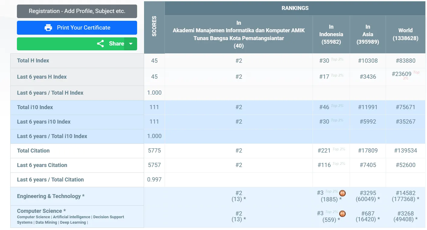 Dengan hasil skor yang tertera di bawah, Anjar Wanto menempati peringkat #30 Indonesia, #10308 Asia, dan #83880 Dunia secara keseluruhan subjek yang termasuk ke dalam kategori AD Scientific Index 2023.