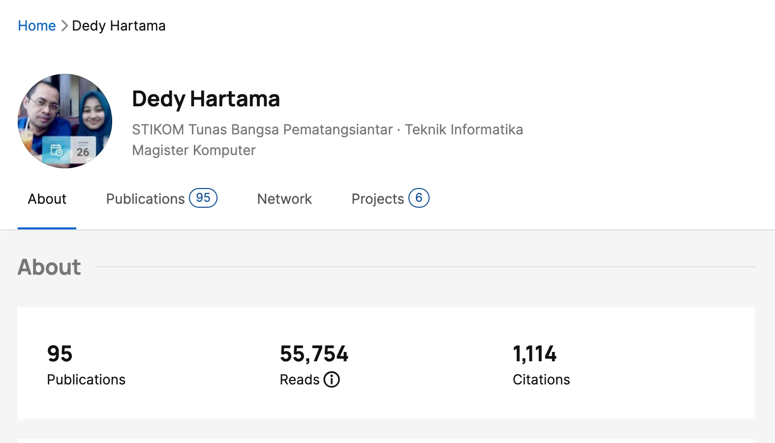 Pada akun Google Scholar milik Dr. Dedy Hartama, ST., M.Kom terdaftar 212 publikasi sejak tahun 2001 hingga 2022. Sedangkan pada akun Research Gate miliknya, Dr. Dedy Hartama, ST., M.Kom memiliki 95 publikasi dengan jumlah sitasi sebanyak 1.114.