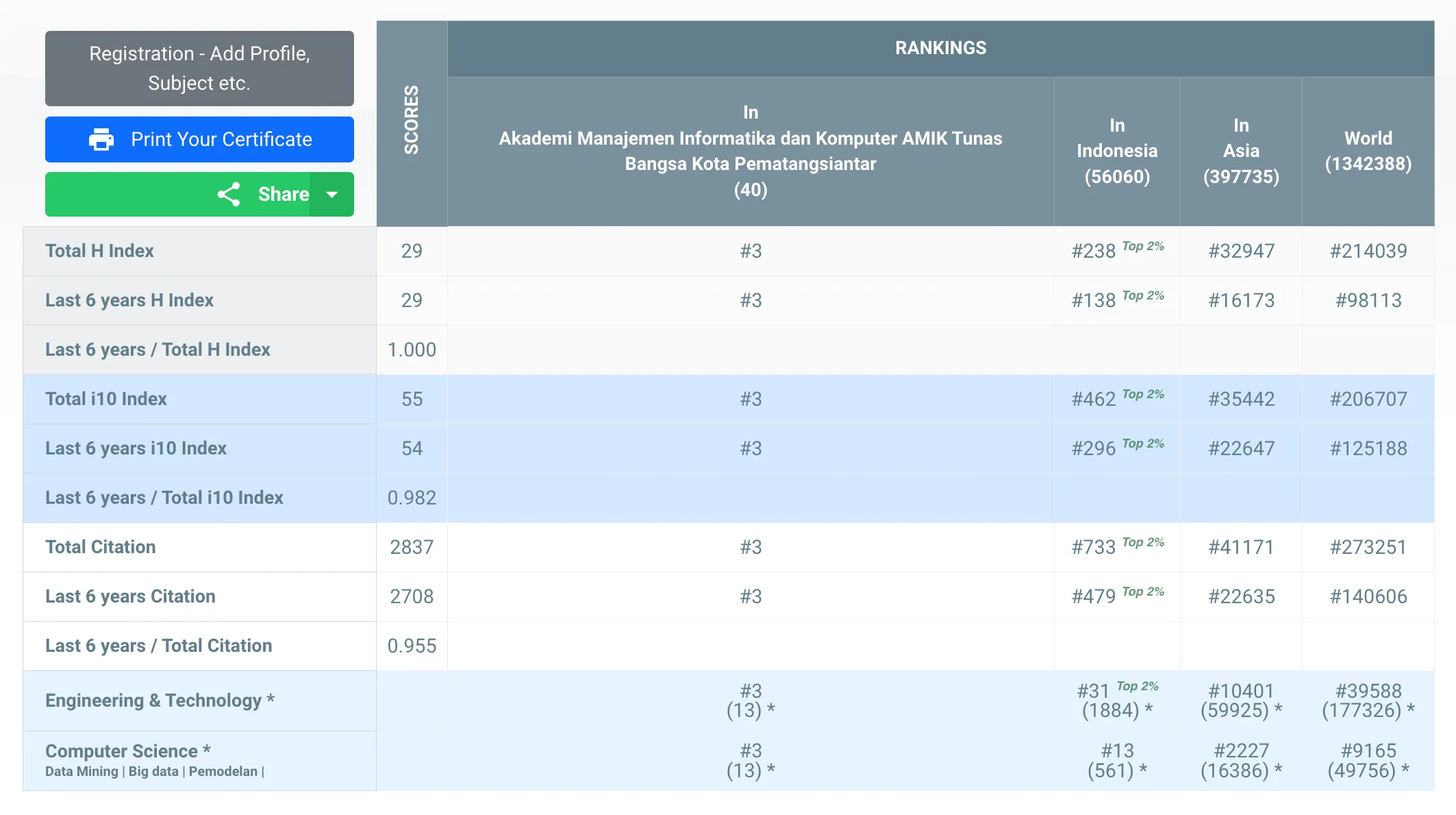 Dengan hasil skor yang tertera di bawah, Dedy Hartama menempati peringkat #3 Universitas (Akademi Manajemen Informatika dan Komputer AMIK Tunas Bangsa Kota Pematangsiantar), #238 Indonesia, #32947 Asia, #214039 Dunia secara keseluruhan subjek yang termasuk ke dalam kategori AD Scientific Index 2023.