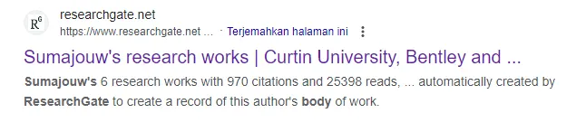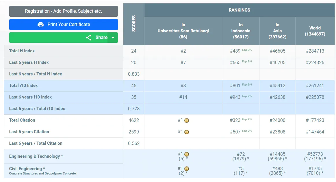 Dengan hasil skor yang tertera di bawah, Dody Mj Sumajouw menempati peringkat #2 Universitas, #489 Indonesia, #46605 Asian, dan #284723 Dunia secara keseluruhan subjek yang termasuk ke dalam kategori AD Scientific Index 2023.