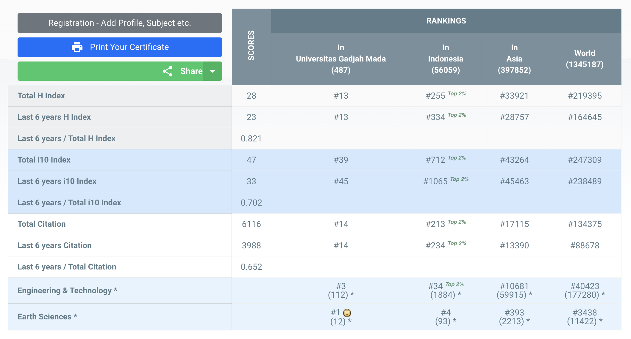 Dengan hasil skor yang tertera di bawah, Hary Christady Hardiyatmo menempati peringkat #13 Universitas (Universitas Gadjah Mada), #255 Indonesia, #33921 Asia, #219395 Dunia secara keseluruhan subjek yang termasuk ke dalam kategori AD Scientific Index 2023.