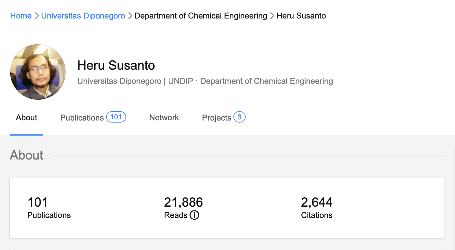 Pada akun Google Scholar milik Prof. Dr. rer. nat. Heru Susanto, ST, MM, MT terdaftar 341 publikasi sejak tahun 1985 hingga saat ini (2023). Sedangkan pada Research Gate miliknya, Prof. Dr. rer. nat. Heru Susanto, ST, MM, MT memiliki 101 publikasi dengan sitasi sebanyak 2.644.