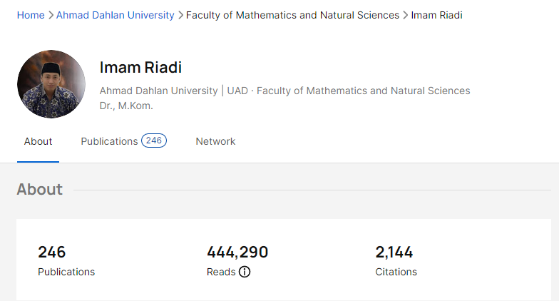 Dilansir dari akun Google Scholar miliknya, Dr. Imam Riadi M.Kom. setidaknya sudah mempublikasi 376 tulisah ilmiah sejak 2003 hingga saat ini. Sedangkan dari akun Research Gate-nya, terdaftar 246 publikasi dengan jumlah sitasi sebanyak 2.144 kali.