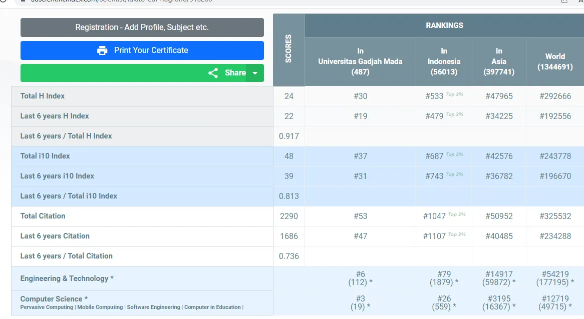 Dengan hasil skor yang tertera di bawah, Lukito Edi Nugroho menempati peringkat #30 Universitas, #533 Indonesia, #47965 Asian, dan #292666 Dunia secara keseluruhan subjek yang termasuk ke dalam kategori AD Scientific Index 2023.