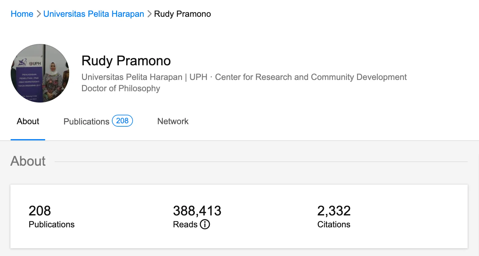 Pada akun Google Scholar milik Dr. Ir. Rudy Pramono, M.Si. terdaftar 253 publikasi sejak tahun 2003 hingga saat ini (2023). Sedangkan pada Research Gate miliknya, Dr. Ir. Rudy Pramono, M.Si. memiliki 208 publikasi dengan sitasi sebanyak dengan sitasi 2.332.