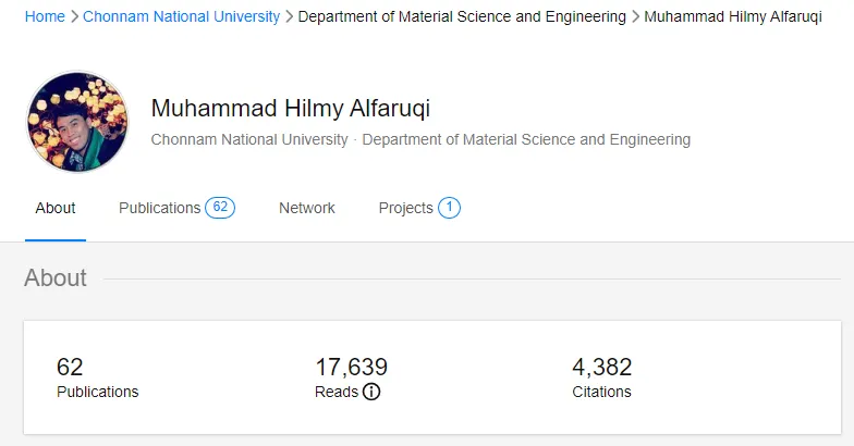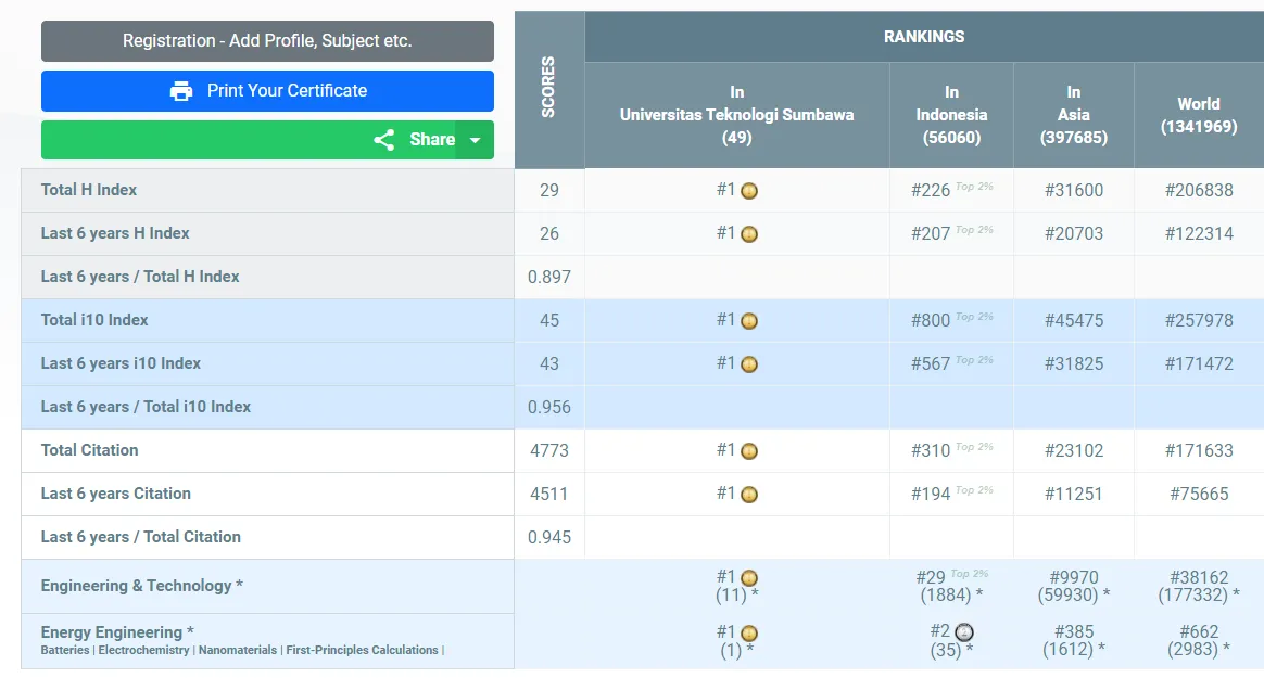 Teknologi.id - Muhammad Hilmy Alfaruqi menjadi Dosen tetap di Universitas Teknologi Sumbawa (UTS) dan menempati peringkat 26 'Indonesia Top 10.000 Scientist' kategori Subjek Engineering & Technology. Pemeringkatan ini dilakukan oleh AD Scientific Index yang merupakan sistem pemeringkatan dan analisis tahunan berdasarkan kinerja ilmiah dan produktivitas dari sebuah universitas dan/atau seorang ilmuan.
