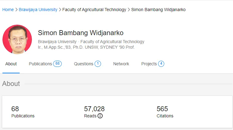 Teknologi.id - Simon Bambang Widjanarko menjadi Dosen di Universitas Brawijaya (UB) Malang dan menempati peringkat 52 'Indonesia Top 10.000 Scientist' kategori Subjek Engineering & Technology. Pemeringkatan ini dilakukan oleh AD Scientific Index yang merupakan sistem pemeringkatan dan analisis tahunan berdasarkan kinerja ilmiah dan produktivitas dari sebuah universitas dan/atau seorang ilmuan.
