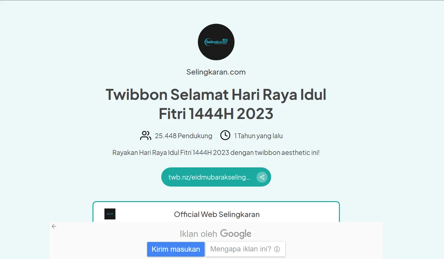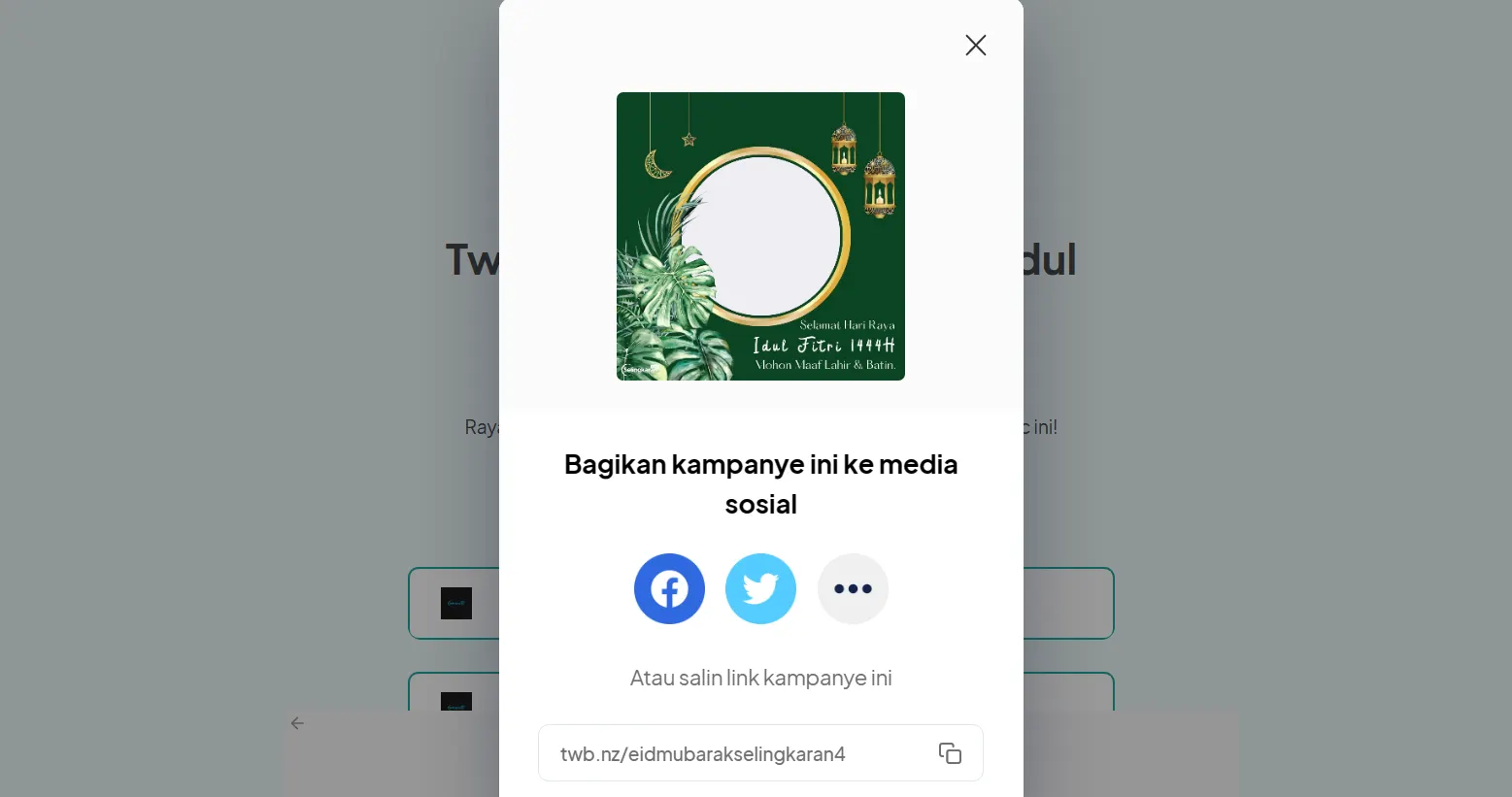 Kamu juga dapat membagikan twibbon ini untuk teman-teman atau kerabat keluargamu agar mereka juga bisa memakai twibbon Idul Fitri 1444 H. Dari situs ini, kamu dapat membagikan twibbon dengan mengeklik tombol berwarna hijau. Tombol dengan tulisan twb.nz/….