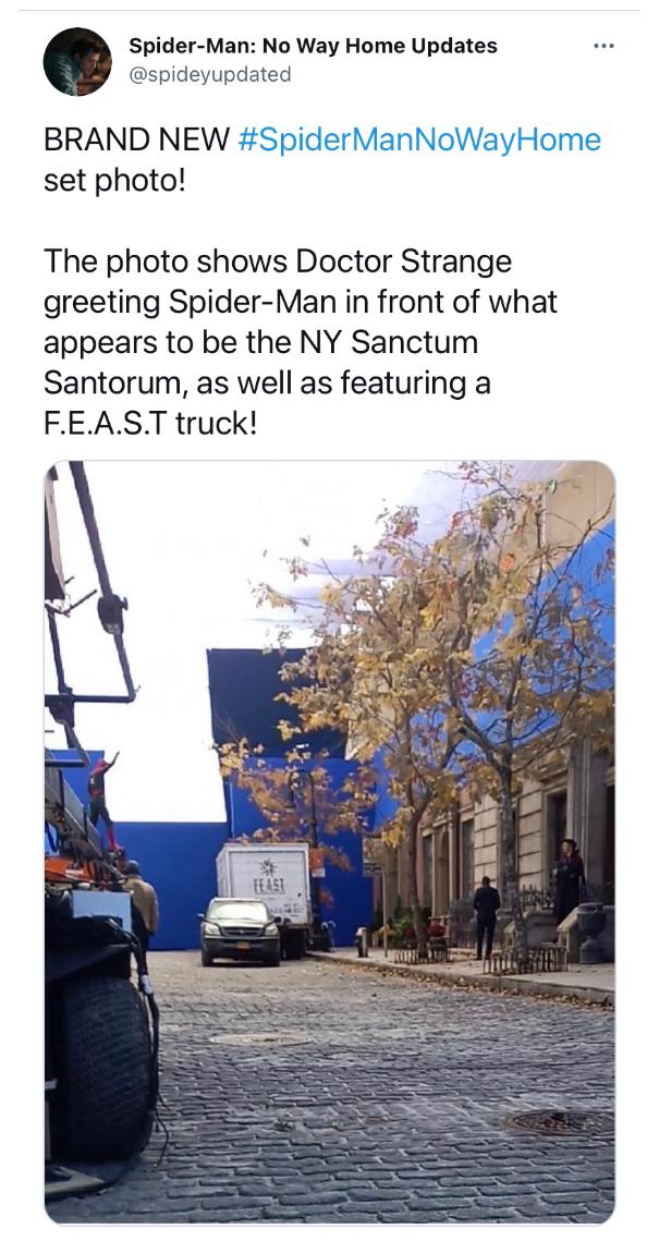 Berdasarkan foto yang dibagikan oleh akun Twitter spideyupdated, terlihat bahwa Doctor Strange dan Spider-Man sedang bertemu di depan New York Sanctum Santorum. Mereka berdua terlihat menggunakan kostum lengkap nya masing-masing. Mungkin saja Spider-Man akan menghadapi masalah yang cukup serius dan meminta bantuan kepada Doctor Strange.