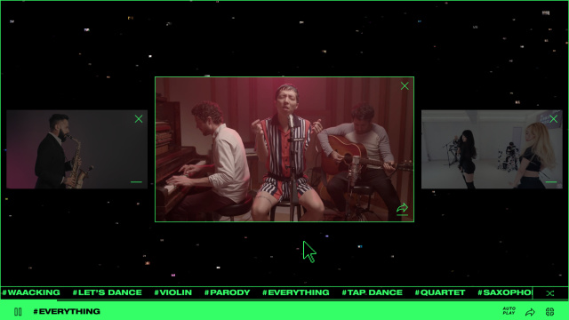 Kamu akan melihat beberapa video di kedua sisi dan banyak tagar di bagian bawah layar, seperti #violin, #quartet, dan #parody. Jika kamu klik tagar tersebut, video akan bertransisi tanpa menghilangkan irama atau lirik.