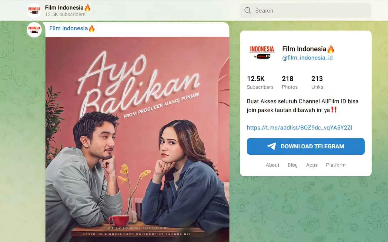 Teknologi.id - Nonton film bajakan melalui telegram semakin marak di Indonesia sepanjang 2025. Pakong pesan instan ini kini bukan hanya digunakan untuk berkomunikasi tetapi juga menjadi “bioskop ilegal” dengan ribuan kanal yang menyediakan film gratis. Cari film lokal hingga internasional, semua bisa diakses dengan mudah bahkan dalam kualitas HD.