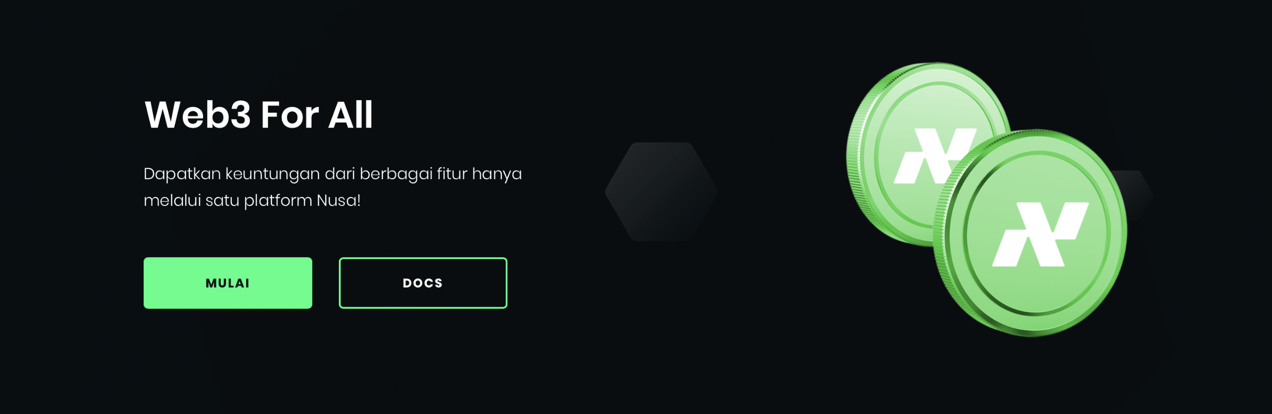 Nusa adalah layanan keuangan berbasis kripto dengan misi mengembangkan ekosistem Web3 yang mudah digunakan dan bermanfaat bagi pengguna. Nusa memiliki berbagai layanan keuangan seperti Lending Market, Swap, Liquidity Provision, Farming, Airdrop, Governance Program, dan NFT Marketplace. Nusa telah memiliki izin resmi dari Kementerian Perdagangan Republik Indonesia di bawah Badan Pengawas Perdagangan Berjangka Komoditi. Akses seluruh layanan Nusa dengan mudah melalui website resmi di Nusa.