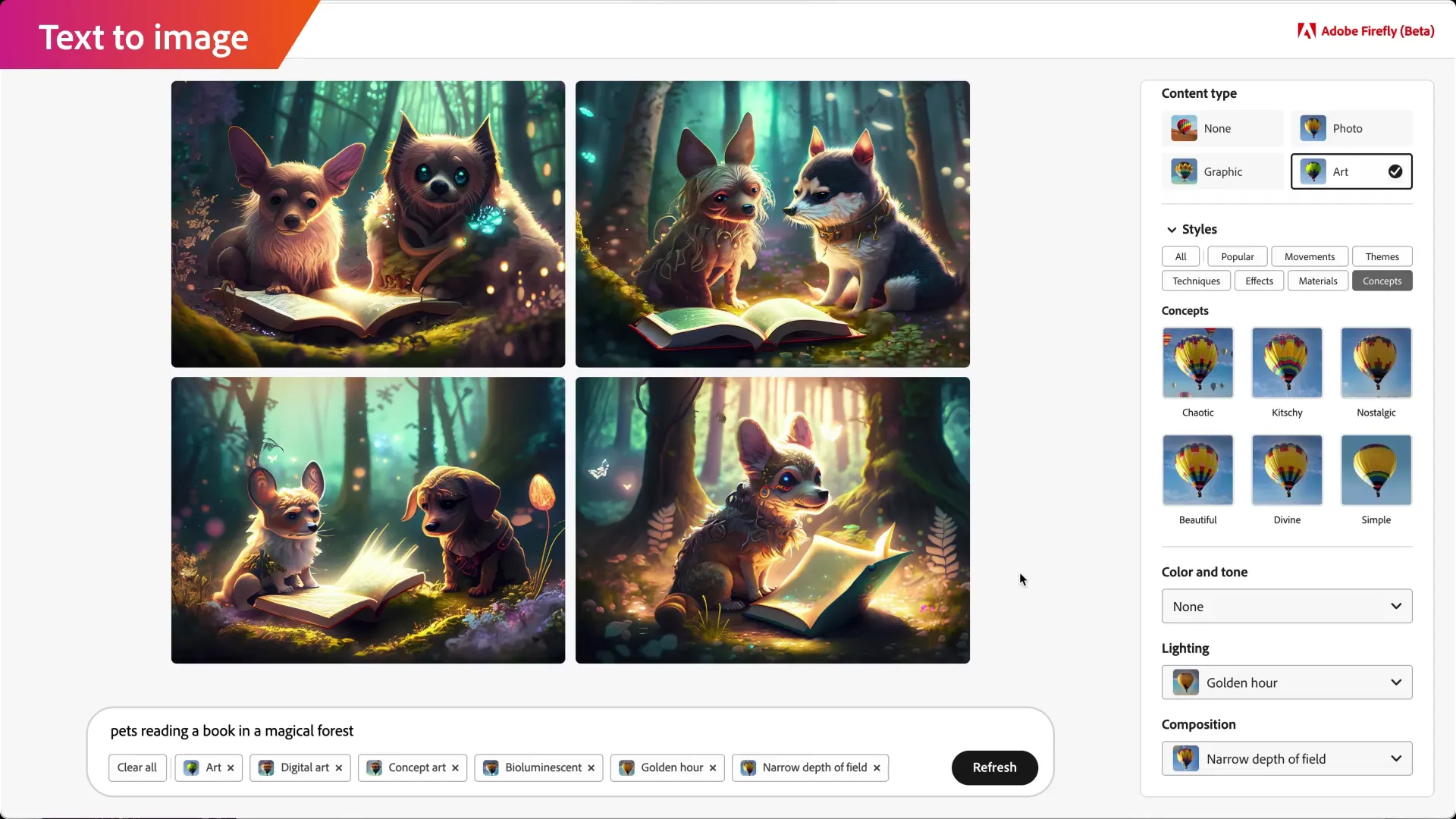 Firefly mengambil pendekatan yang berbeda. Tampilan umum dari gambar yang dihasilkan ditentukan oleh menu drop-down dan tombol. Kamu dapat mengetik "Batman mengendarai skuter" lalu memilih tampilan yang diinginkan dari beberapa pilihan. Costin juga menjelaskan bahwa gambar tidak diperbarui setiap kali memilih gaya baru.