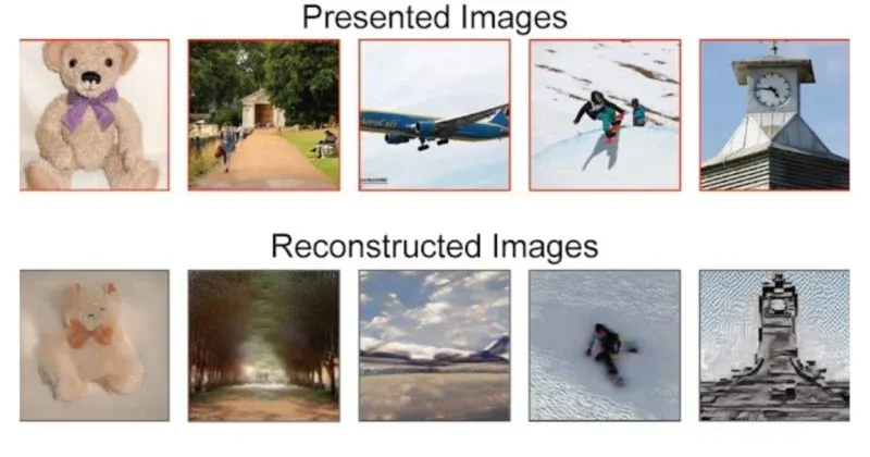 Pada gambar di atas, gambar di kotak merah atas menunjukkan gambar asli yang disajikan kepada individu dalam penelitian. Sedangkan gambar pada baris paling bawah merupakan citra yang direkonstruksi dari aktivitas otak manusia menggunakan Stable Diffusion, Semantic Decoder, dan fMRI image generation.