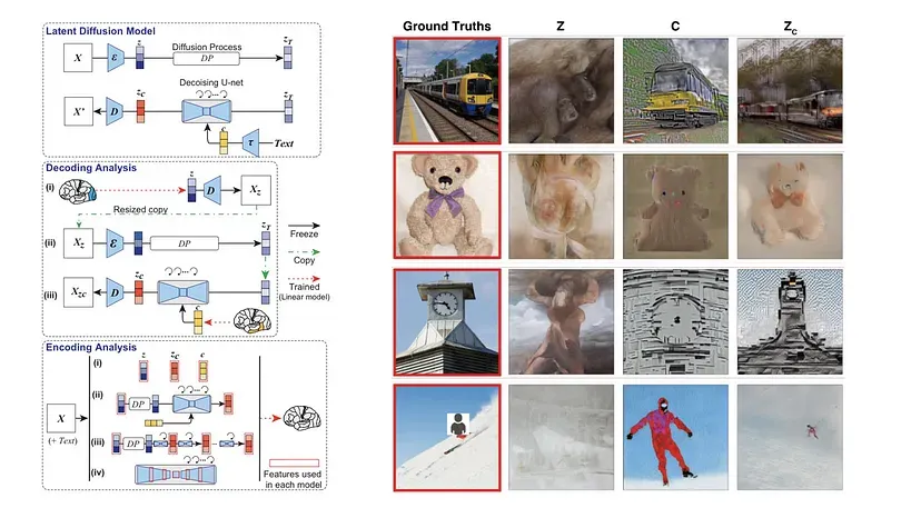 KIRI: Encoder dan decoder gambar digunakan, bersama dengan encoder teks yang disebut CLIP. Studi ini menggunakan analisis decoding untuk memecahkan kode representasi laten gambar dan teks terkait dari sinyal fMRI di berbagai bagian korteks visual, dan kemudian menggunakan representasi ini untuk merekonstruksi gambar. Studi ini juga menggunakan model pengkodean untuk memprediksi sinyal fMRI dari berbagai komponen LDM. KANAN: Gambar yang direkonstruksi untuk satu subjek yang disajikan (dalam kotak merah).