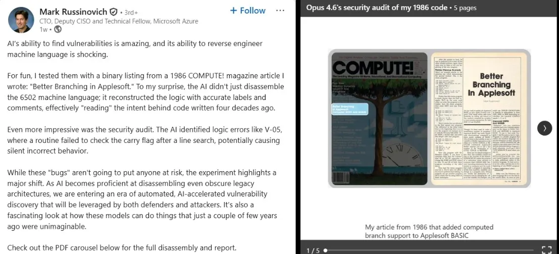 Adalah Mark Russinovich, Chief Technology Officer (CTO) Microsoft Azure, yang menguji ketangguhan model AI terbaru dari Anthropic, Claude Opus 4.6. Melalui unggahan profesional di LinkedIn, Russinovich membagikan pengalamannya saat memasukkan barisan kode biner dari era komputer Apple II ke dalam sistem AI tersebut untuk dievaluasi.