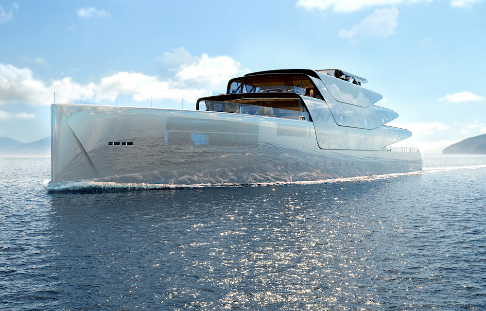 Desain eksterior dimulai dengan lambung linier rendah dengan busur vertikal dan lapisan logam perak. Fitur ini mengaburkan garis pemisah antara kapal pesiar dan laut itu sendiri, seolah-olah kapal itu sejajar dan menyatu dengan air.