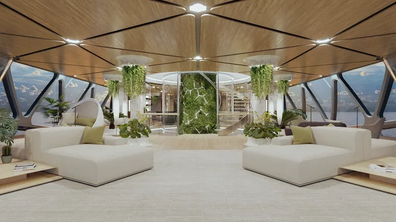 interior kapal dan membentang di semua empat tingkat kapal. Tanaman hijau dan