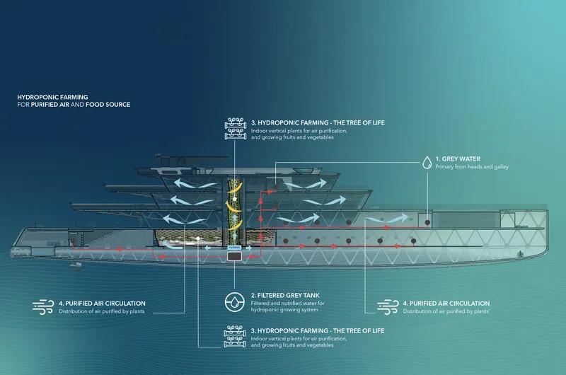 Superstruktur kaca yang melapisi kapal pesiar Pegasus akan menggabungkan panel surya transparan untuk menggerakkan elektroliser yang mengekstraksi hidrogen dari air laut. Sel bahan bakar ini mengubah hidrogen menjadi listrik yang disimpan dalam baterai Li-on untuk menyalakan pod azimuth dan semua sistem.