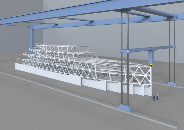 Saat membangun superyacht, pencetakan robot 3D digunakan untuk membuat kerangka jaring yang mengintegrasikan lambung dan superstruktur. Hasilnya adalah struktur yang sangat kuat dan ringan yang dapat dibuat dengan lebih sedikit bahan dan limbah.