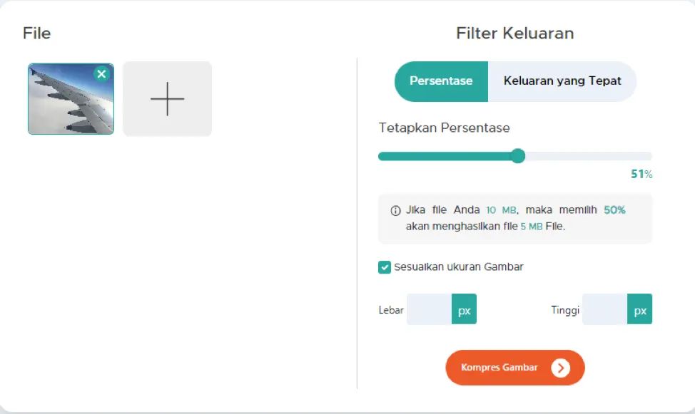 Misalnya, Anda dapat menggunakan penggeser persentase untuk menentukan persentase gambar yang ingin Anda kompres. Demikian juga, filter 'Exact Output' memungkinkan Anda menentukan ukuran gambar yang tepat dalam KB. Opsi ini membantu Anda mendapatkan hasil yang diinginkan tanpa keributan.