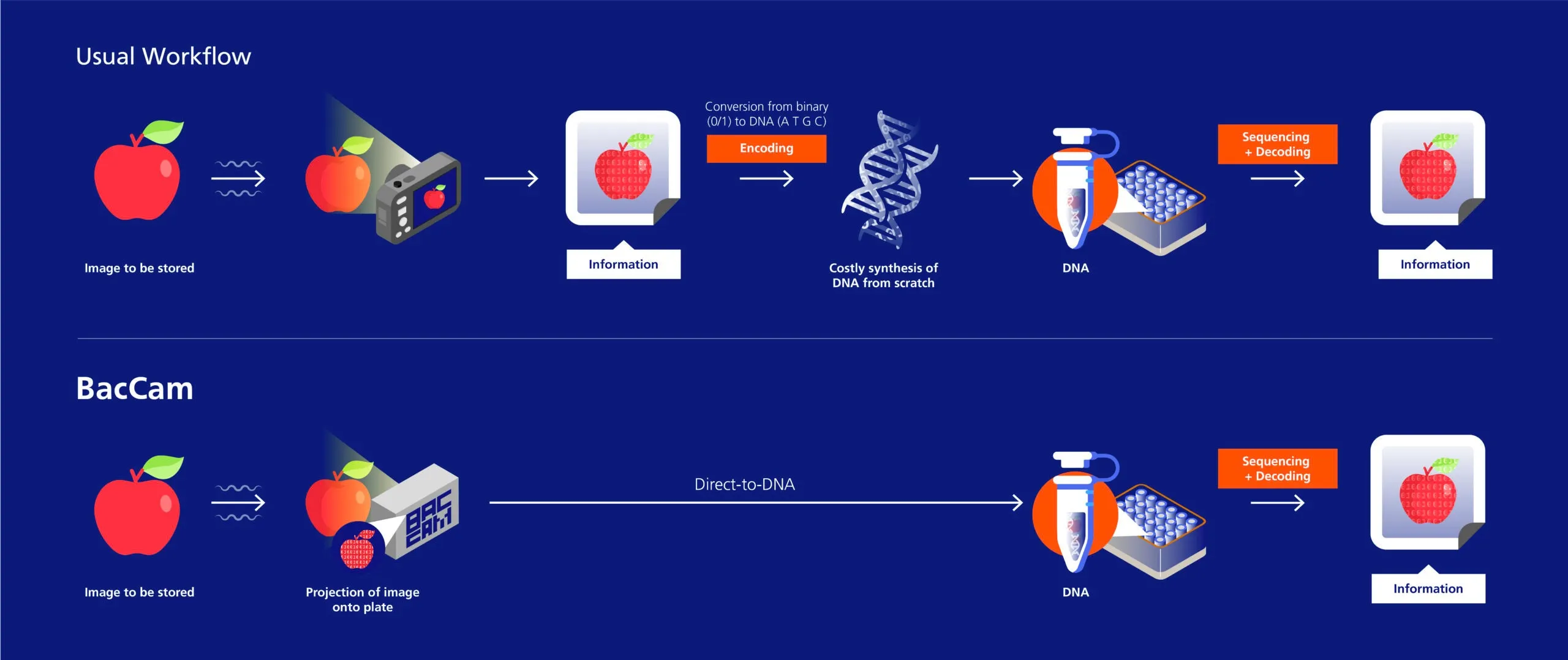 Sebaliknya, BacCam yang dikembangkan oleh para peneliti NUS mengatasi hambatan-hambatan ini dengan memanfaatkan DNA hidup untuk menyimpan informasi. Terinspirasi oleh kamera digital modern, BacCam menangkap dan menyimpan gambar, tetapi bukan dengan menggunakan kartu memori, melainkan dengan mengkodekan dan menyimpan informasi langsung ke dalam DNA. Tim mencapai prestasi ini dengan memanfaatkan sirkuit optogenetik, yang mengendalikan aktivitas sel menggunakan cahaya, mirip dengan mekanisme rana kamera. Dengan mencetak sinyal cahaya ke "film" DNA, BacCam menangkap dan menyimpan gambar secara simultan, memanfaatkan kemampuan multiplexing cahaya untuk mengkodekan lapisan informasi tambahan.