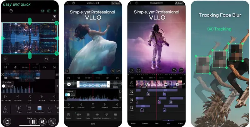 Terakhir, ada VLLO merupakan aplikasi yang memiliki tampilan intuitif sangat cocok baik untuk pemula maupun profesional. Kita dapat dengan mudah edit video seperti memotong video, menambahkan teks, transisi yang smooth, menambahkan musik–baik merekam suara langsung maupun dari file–beragam stiker, efek, dan filter. Selain itu, kita juga dapat mengatur resolusi, rasio, dan kualitas video sesuai kebutuhan sebelum memulai proses edit. Aplikasi ini tersedia untuk perangkat iOS dan Android.