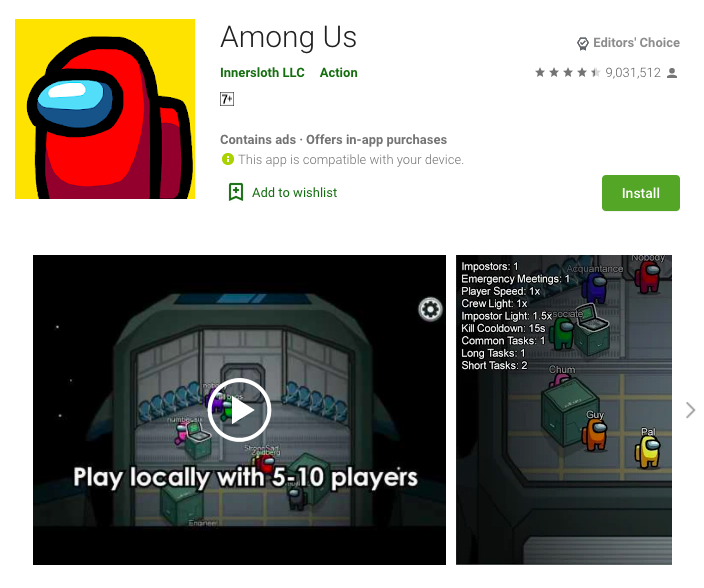 Di urutan pertama ditempati oleh game Among Us. Game ini mendadak populer pada tahun 2020. Hingga saat artikel ini ditulis, Among Us sudah diunduh lebih dari 100 juta kali.