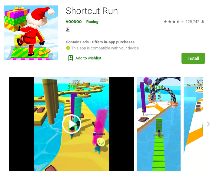 Di urutan kedua ada game Shortcut Run. Hingga saat ini total terdapat lebih dari 10 juta instalasi atas game ini. Game ini dirilis oleh Voodoo. Rating game ini adalah 3,6 di Google Play. Untuk jumlah review, hingga saat artikel ini ditulis, game ini baru mendapatkan review sekitar 128 ribu review.