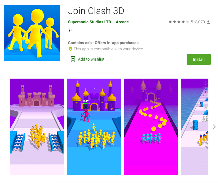 Di urutan ketiga terdapat game Join Clash 3D. Game ini mendapatkan rating 4,1 di Google Play. Selain itu, game ini juga sudah diunduh lebih dari 100 juta kali. Di dalam game ini, pemain akan berlari sendirian. Selanjutnya ia bisa mengumpulkan orang-orang dan membangun kerumunan untuk melewati berbagai rintangan. Tertarik? Yuk langsung saja mainkan game ini.