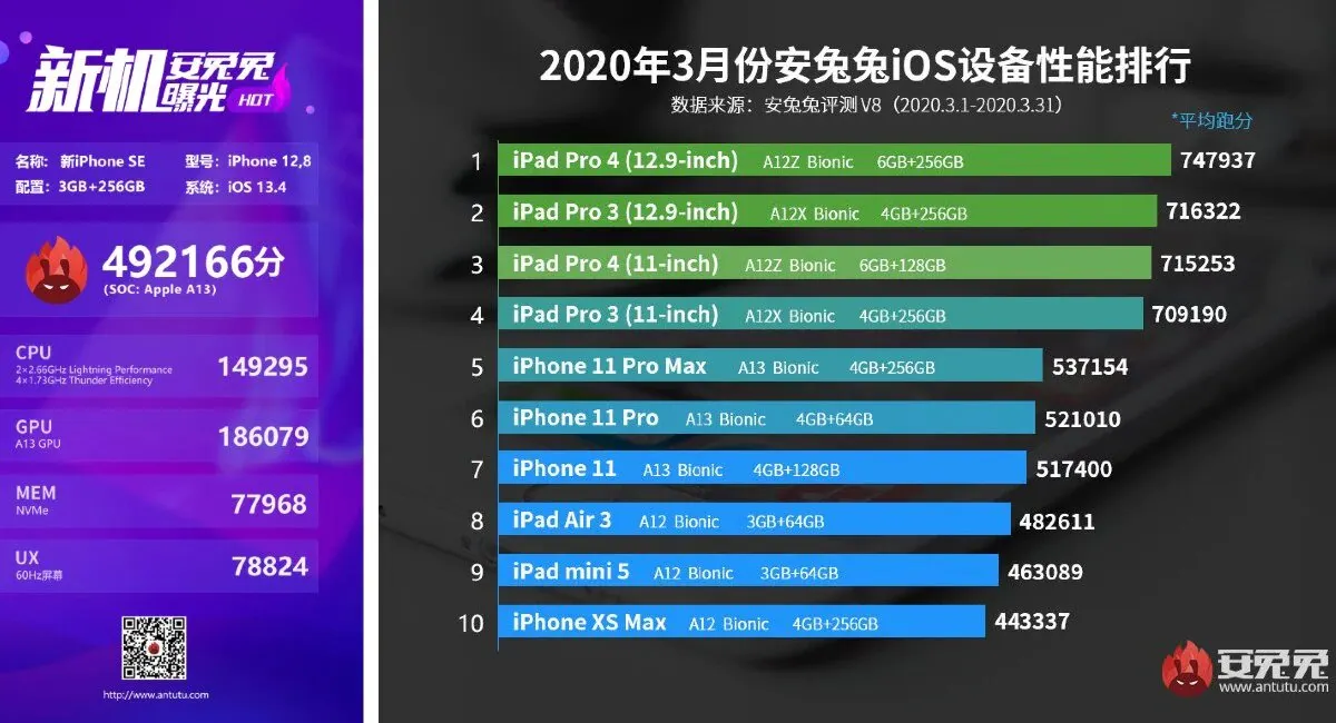 Namun baru-baru ini AnTuTu akhirnya memposting skor iPhone SE yang ternyata di bawah 500.000, tepatnya 492.116. Skor tersebut masih terlampau jauh bila dibandingkan dengan iPhone 11 Pro Max yang memiliki skor performa 537.154.