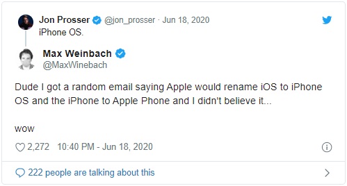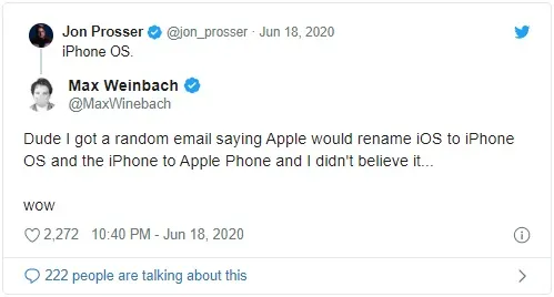 Weinbach menanggapi cuitan Prosser dan mengaku telah mendapatkan kabar bahwa Apple akan mengubah nama iOS ke iPhone OS dan iPhone menjadi Apple Phone.