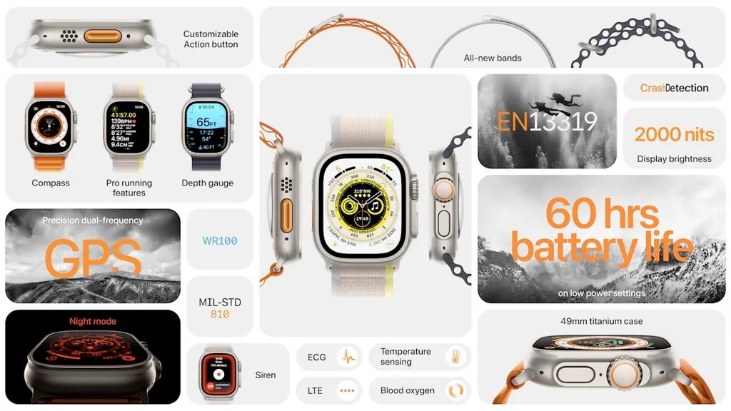 Apple Watch Ultra dibekali dengan tiga band baru yaitu, Alpine Loop yang dibuat dengan loop nilon dua lapisan, loop Ocean yang dirancang khusus untuk olahraga air ekstrem dan Trail Loop yang ringan.