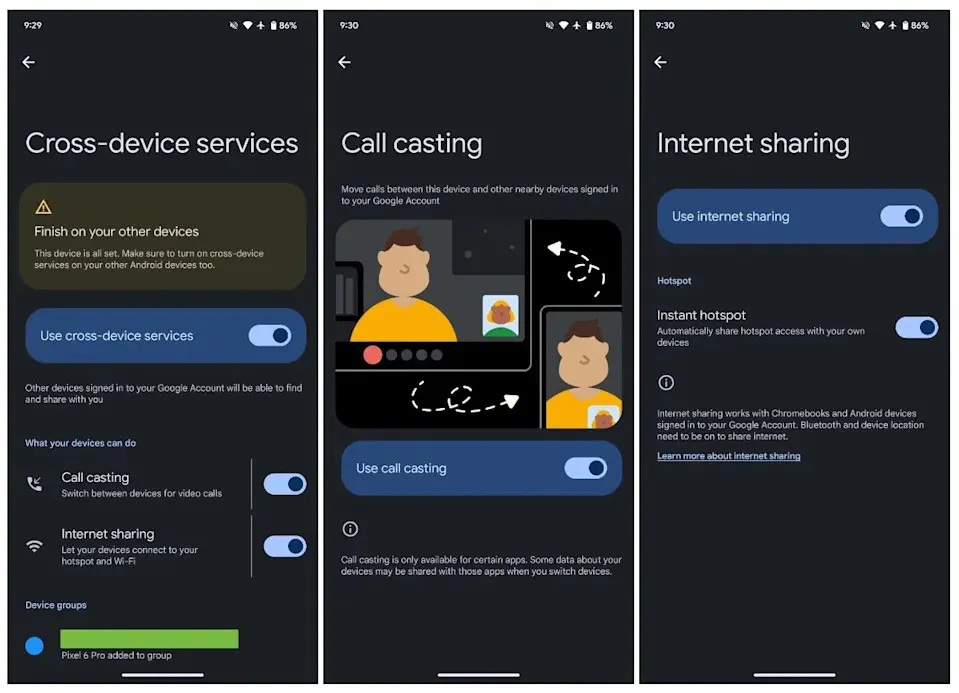 Sampai saat ini, fitur call casting dan internet sharing baru tersedia di Android 11+ yang menjalankan layanan Google Play versi 24.28.34. Selain itu, fitur ini masih dikemas dalam versi beta. Google diharapkan dapat segera melakukan peluncuran secara meluas sehingga fitur ini dapat dinikmati oleh pengguna di berbagai wilayah di dunia.