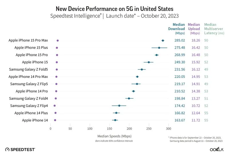 Dari sekian banyak ponsel di dunia, Ookla mengunkapkan bahwa iPhone 15 series menjadi series HP yang memiliki koneksi 5G paling cepat di dunia. Data yang dilaporkan oleh Ookla dikumpulkan dari 13 negara antara bulan September dan Oktober 2023 untuk iPhone, dan bulan Agustus sampai Oktober untuk ponsel Samsung.