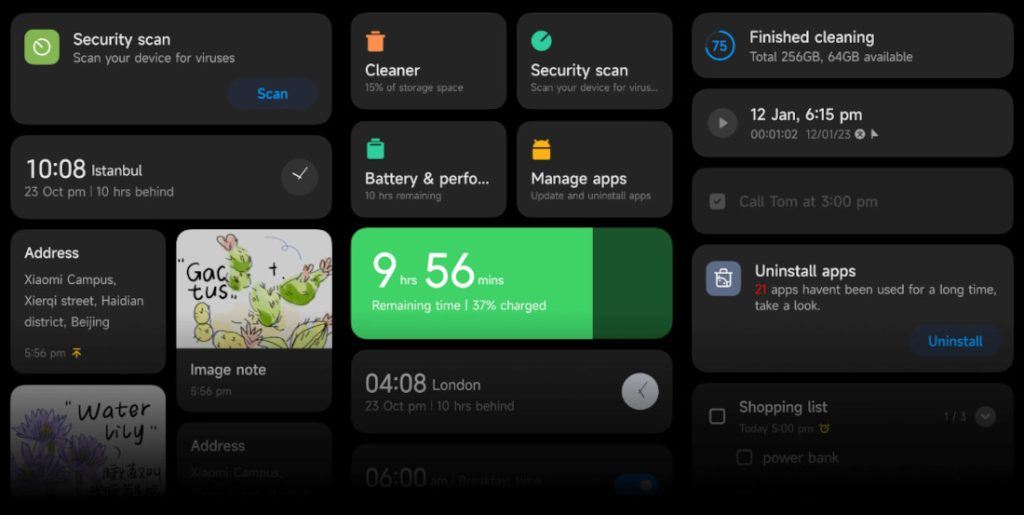 Ada pula fitur baru di MIUI 14 yaitu widget hewan peliharaan atau tanaman, yang serupa dengan fitur di iOS. Fitur ini memungkinkan pengguna untuk merawat dan bermain dengan hewan atau tanaman virtual langsung di layar utama.