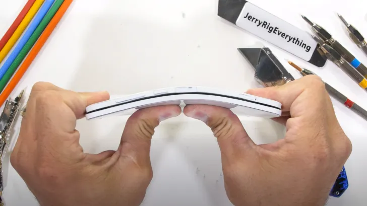 Aksi uji "Bend Test" atau uji kelenturan yang dilakukan JerryRigEverything cukup mengundang kekhawatiran lantaran ponsel dibengkokkan ke kedua sisi dan kemudian dipanaskan dengan api.