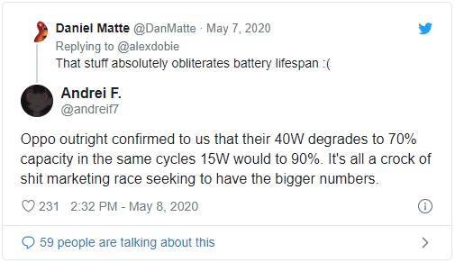 Pernyataan Oppo ini juga didukung lewat cuitan pemilik akun twitter @Andre.f pada Kamis pekan lalu, yang mengungkap konfirmasi Oppo mengenai pengaruh fitur fast charging pada usia baterai dengan presentase serupa.