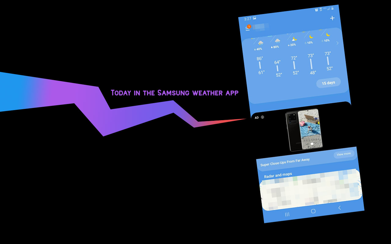 Sejumlah aplikasi bawaan yang dimaksud adalah aplikasi cuaca (Weather), Samsung Health, serta Samsung Pay. Ketiganya menampilkan iklan banner yang cukup memakan tempat pada aplikasi-aplikasi bawaan tersebut.