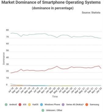 Menurut data yang dihimpun Statista, pangsa pasar Android secara global yang pada tahun 2018 mencapai 77,32%, terus menurun menjadi 69,74% pada Januari 2022.