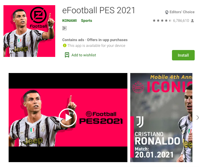 Yang pertama ada game bernama eFootball PES Mobile. Game yang dirilis oleh Konami ini merupakan salah satu game bola Android terfavorit. Terlihat dari rating yang tinggi yakni 4,4. Hingga saat artikel ini ditulis, game ini sudah diinstal lebih dari 100 juta kali.